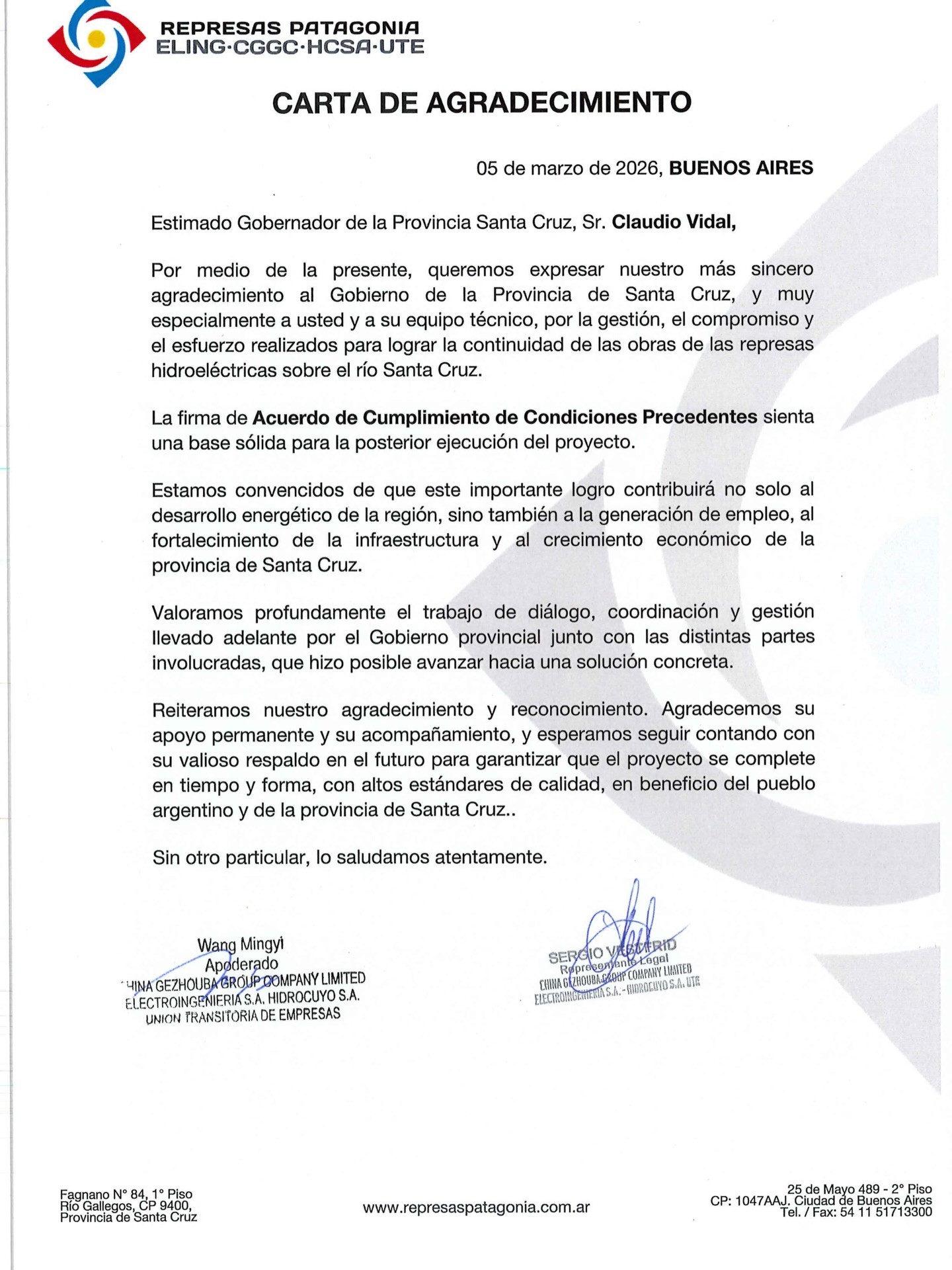 El gobernador de Santa Cruz, Claudio Vidal, expresó su agradecimiento a la empresa Represas Patagonia por el reconocimiento público al trabajo de gestión, diálogo y articulación que viene llevando adelante el Gobierno Provincial para garantizar la continuidad de una obra estratégica para la provincia y para el país.