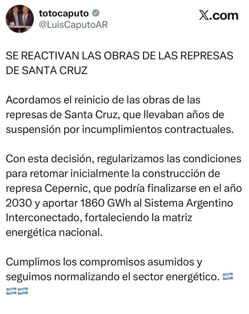 A su vez, el mandatario provincial resaltó las recientes declaraciones del ministro de Economía de la Nación, Luis Caputo, quien confirmó que se reactivan las obras de las represas de Santa Cruz, luego de años de paralización por incumplimientos contractuales. El ministro señaló además que esta decisión permitirá regularizar las condiciones para retomar inicialmente la construcción de la represa Cepernic, con proyección de finalización en 2030 y un aporte estimado de 1860 GWh al Sistema Argentino Interconectado, fortaleciendo así la matriz energética nacional.